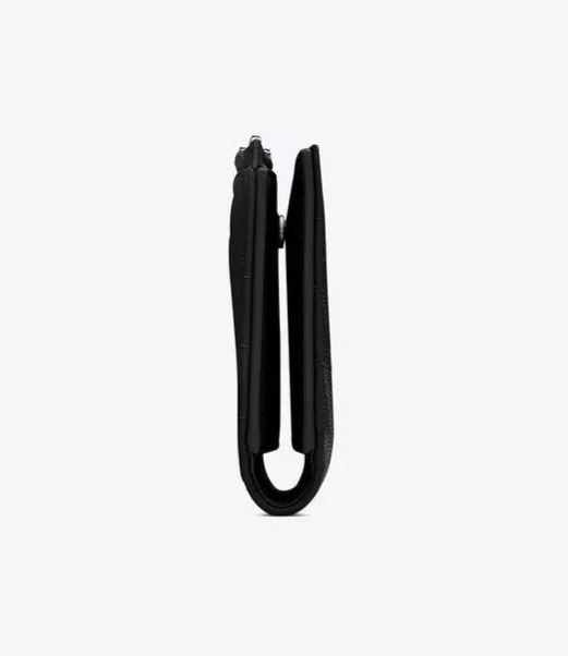金属製のYSLロゴとキルティングのトップステッチで飾られたモノグラムの小さな二つ折り財布。