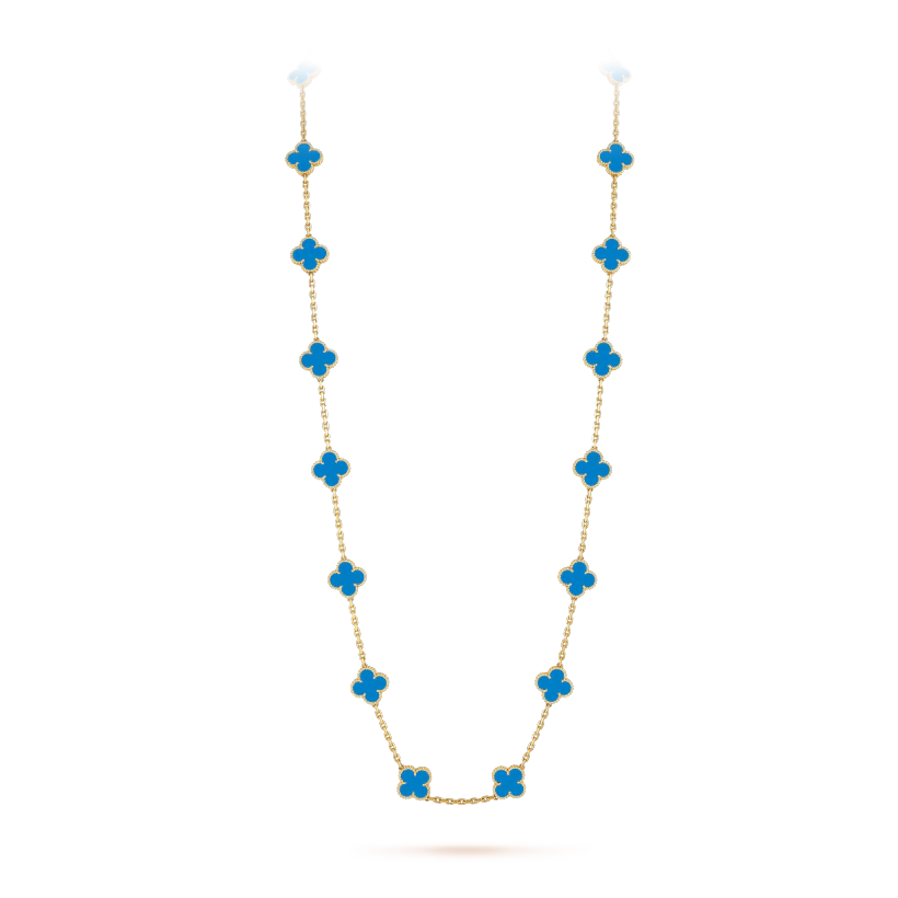 ヴィンテージ アルハンブラ ロングネックレス、20 モチーフ、イエローゴールド、ブルーアゲート。