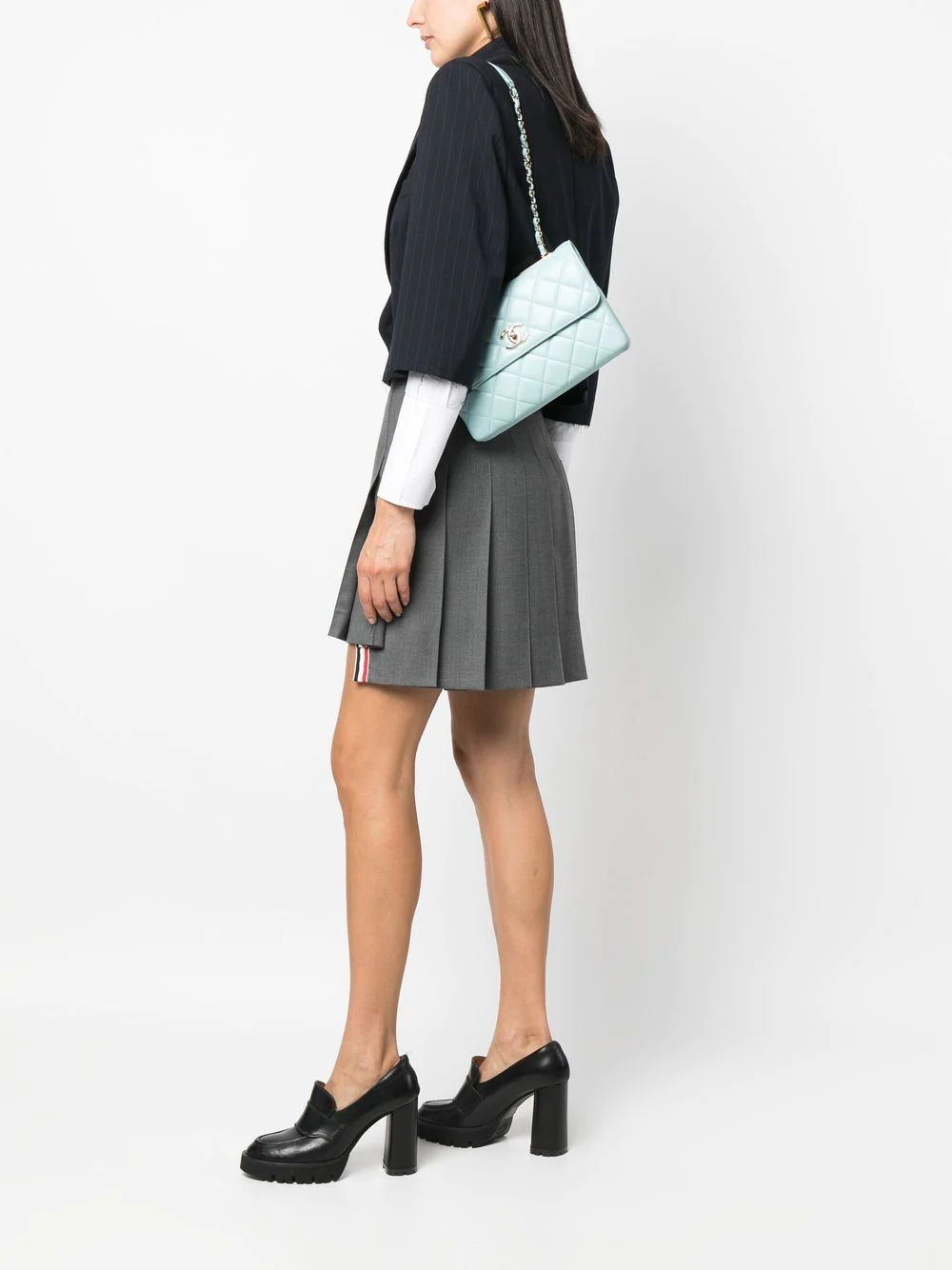 コーディネートに使用したアイテム: Thom Browne ドロップバック ミニ プリーツスカート スーパー120'Sツイル Off-White オフホワイト ロゴ シャツ ATP Atelier Cardona 110mm ローファー