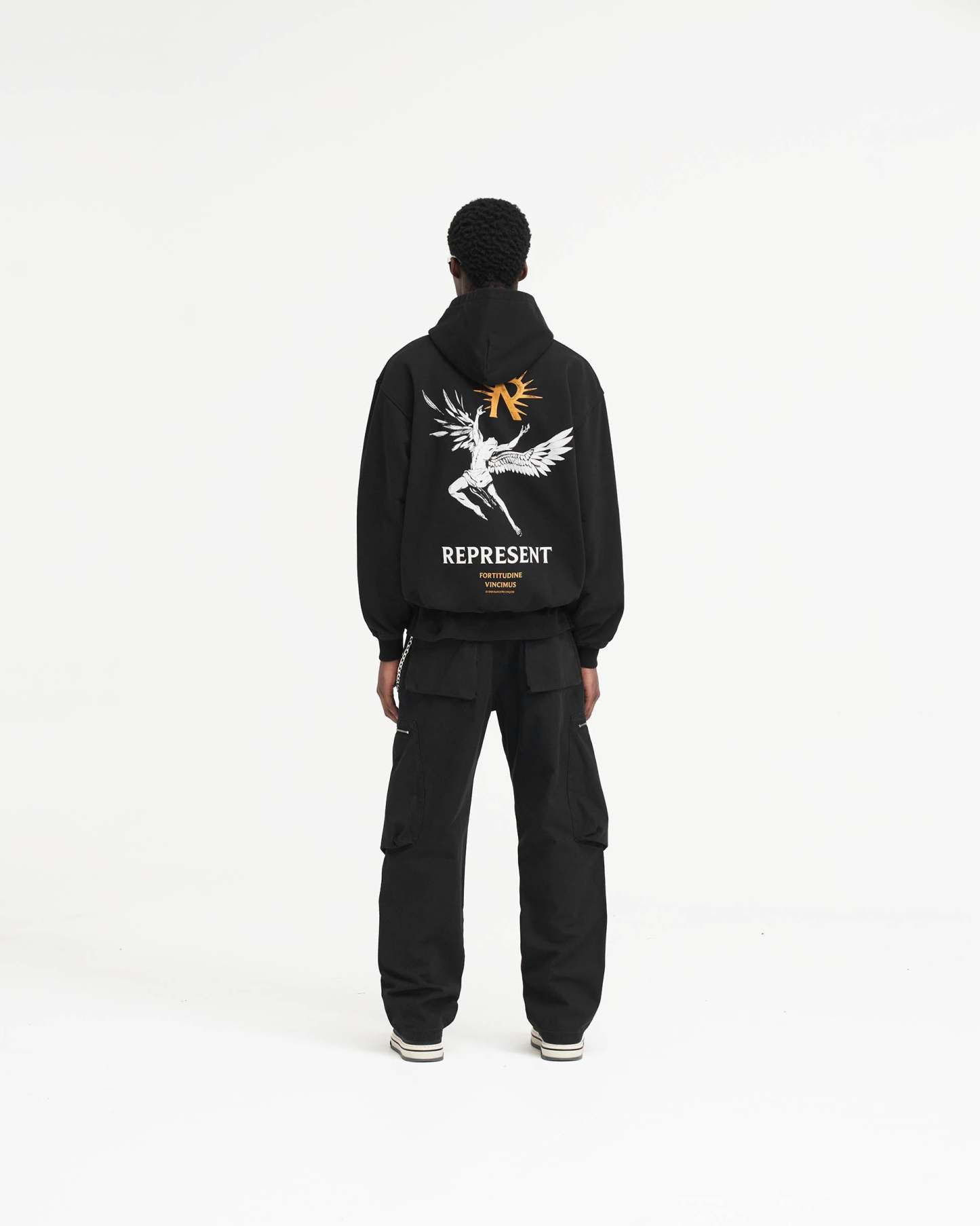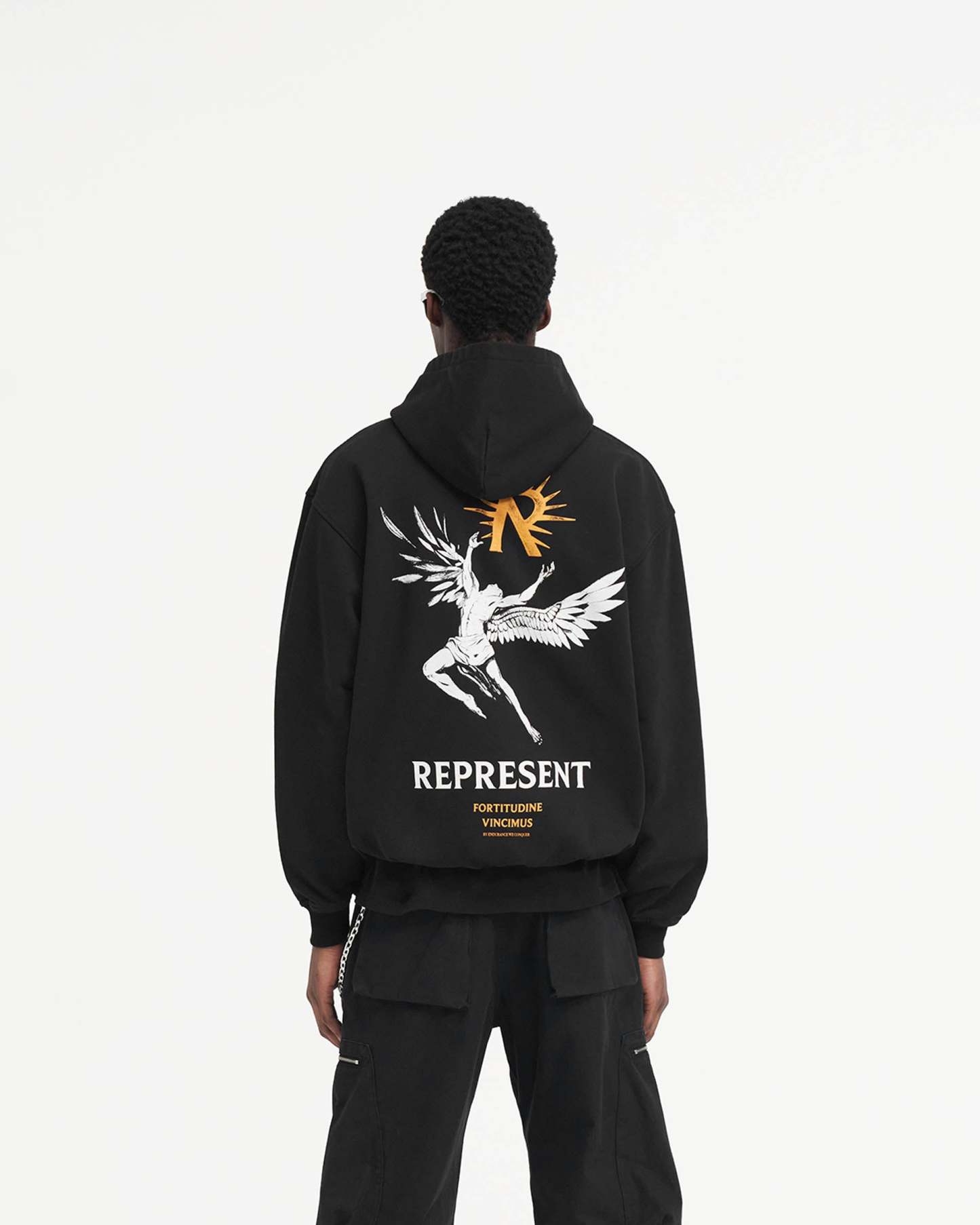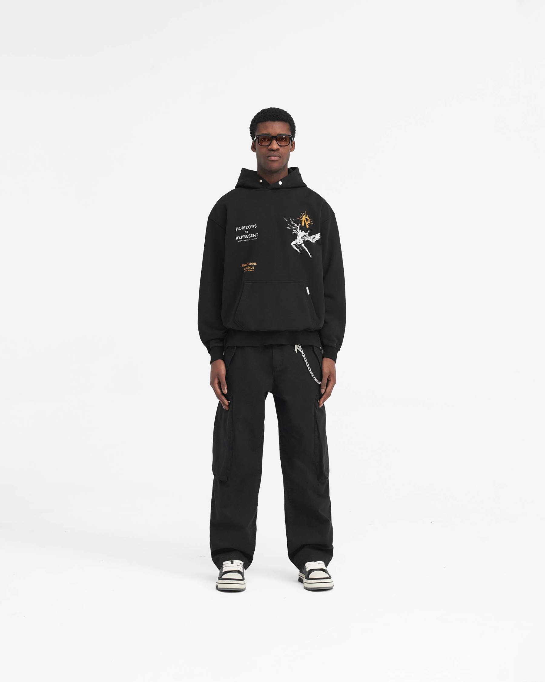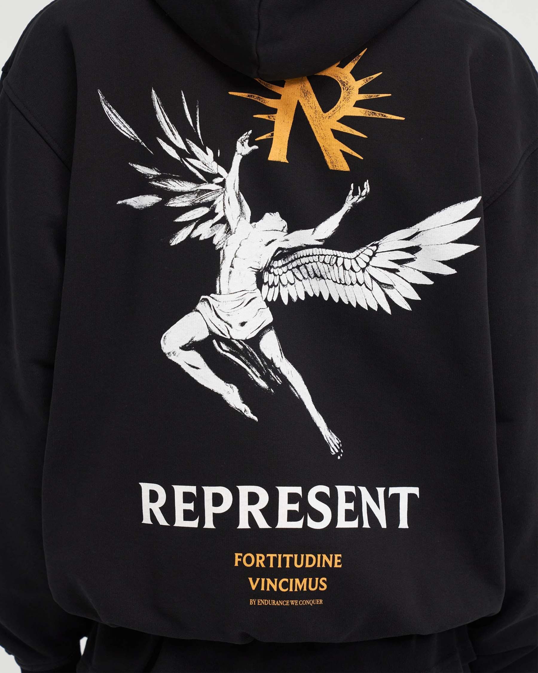 Introducing the Icarus Hoodie in Jet Black, a luxury hoodie crafted with an oversized fit. The hoodie has ribbed hem and cuffs and is finished with a Represent metal bar to the pocket and Cobrax popper to the hood.