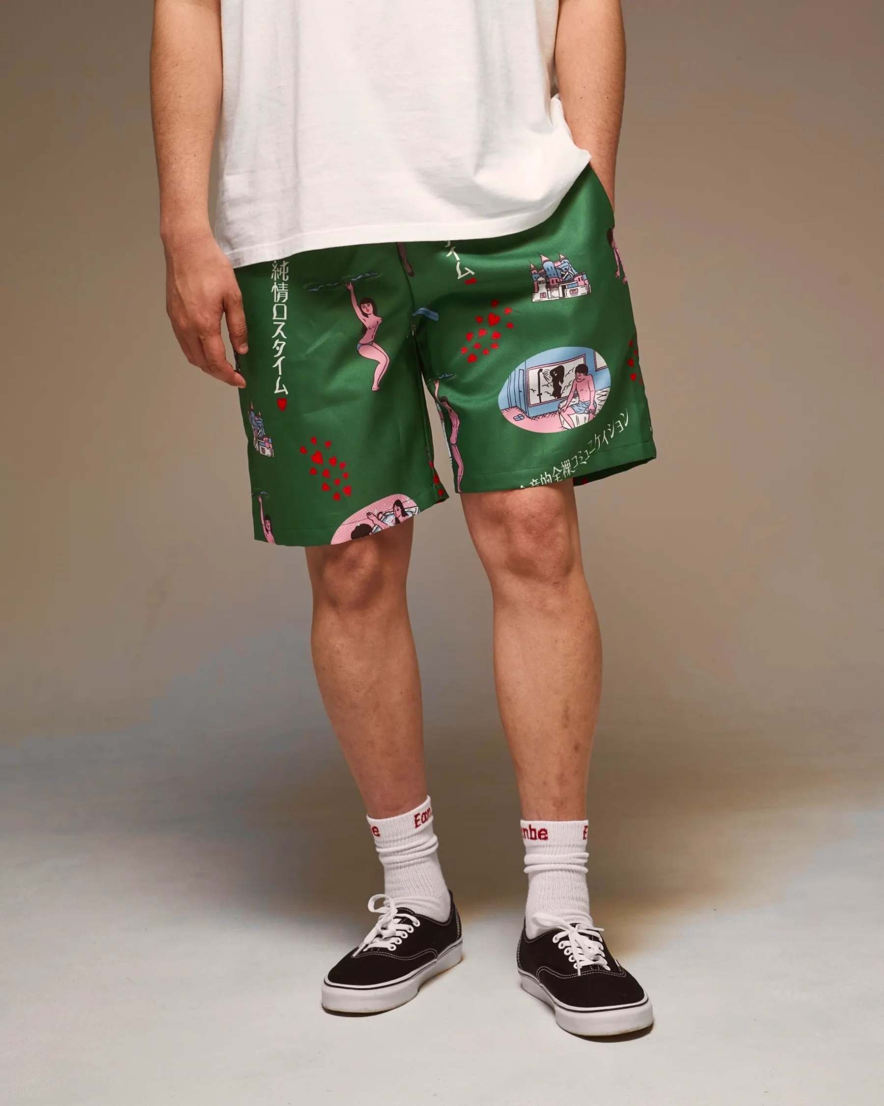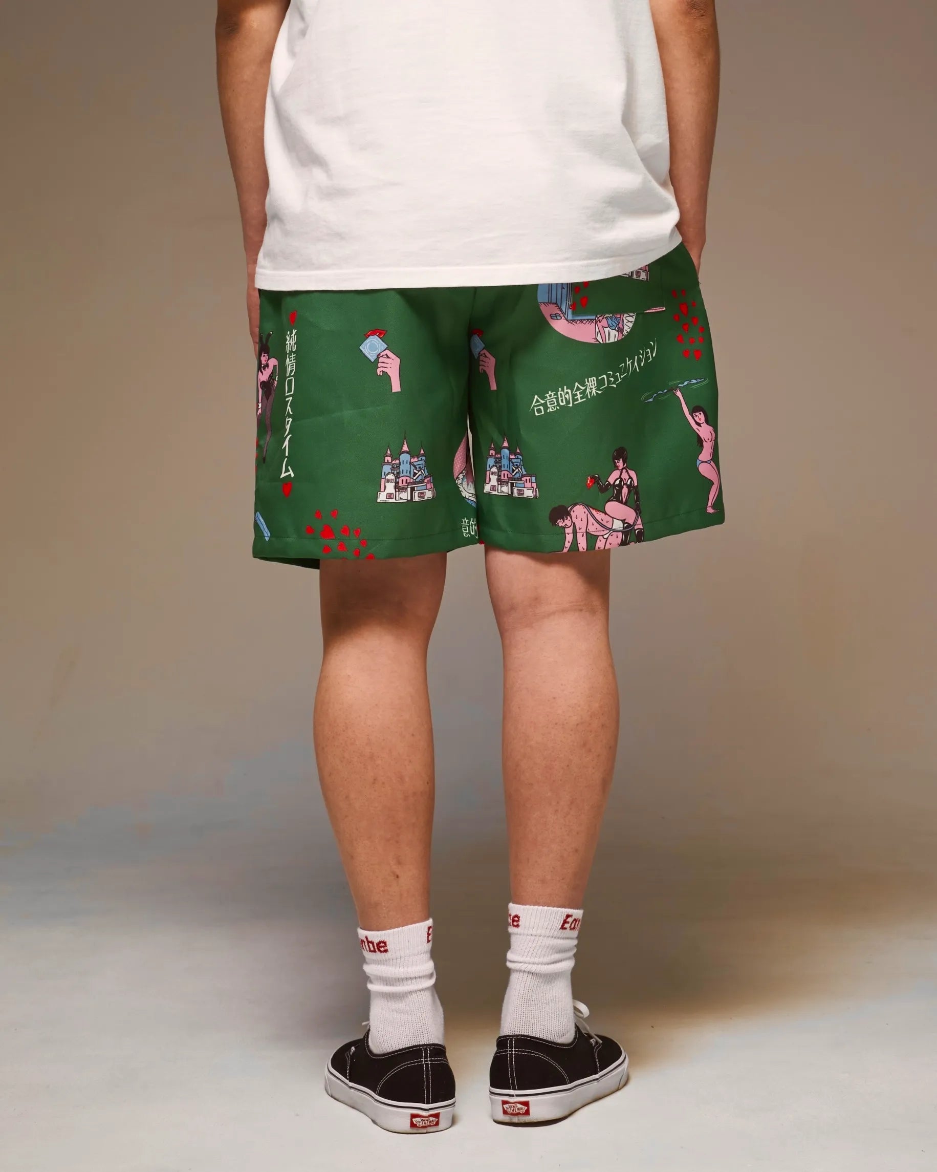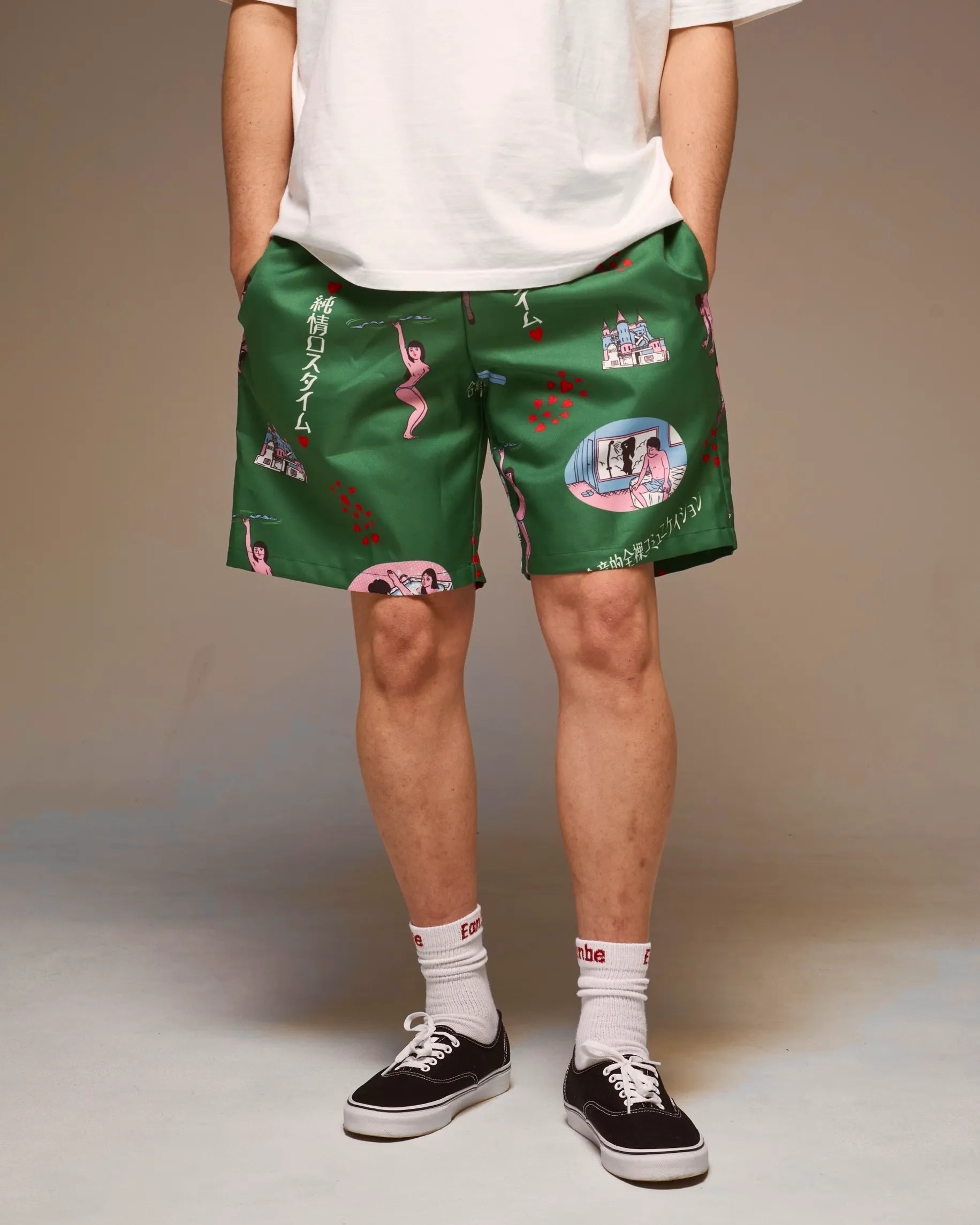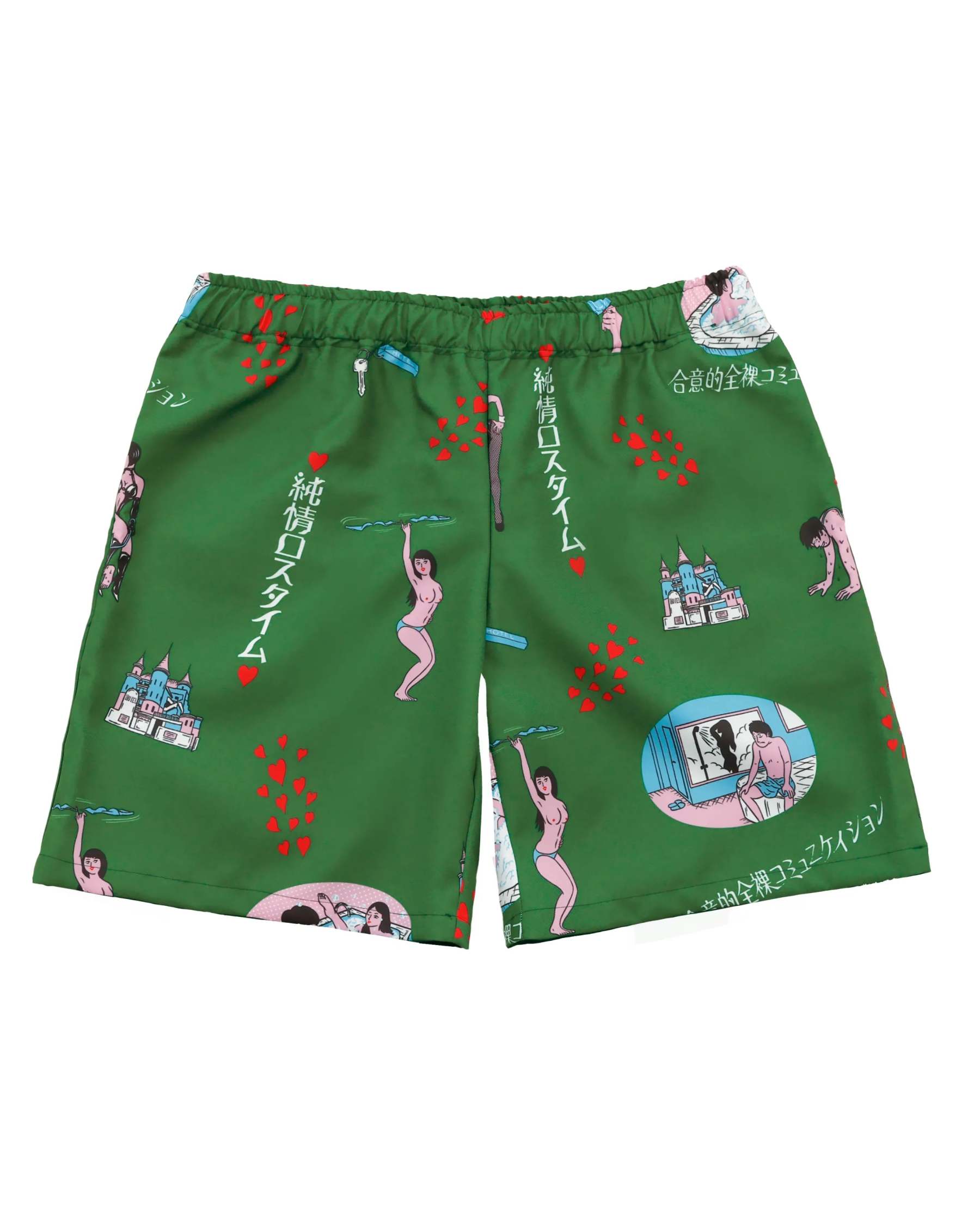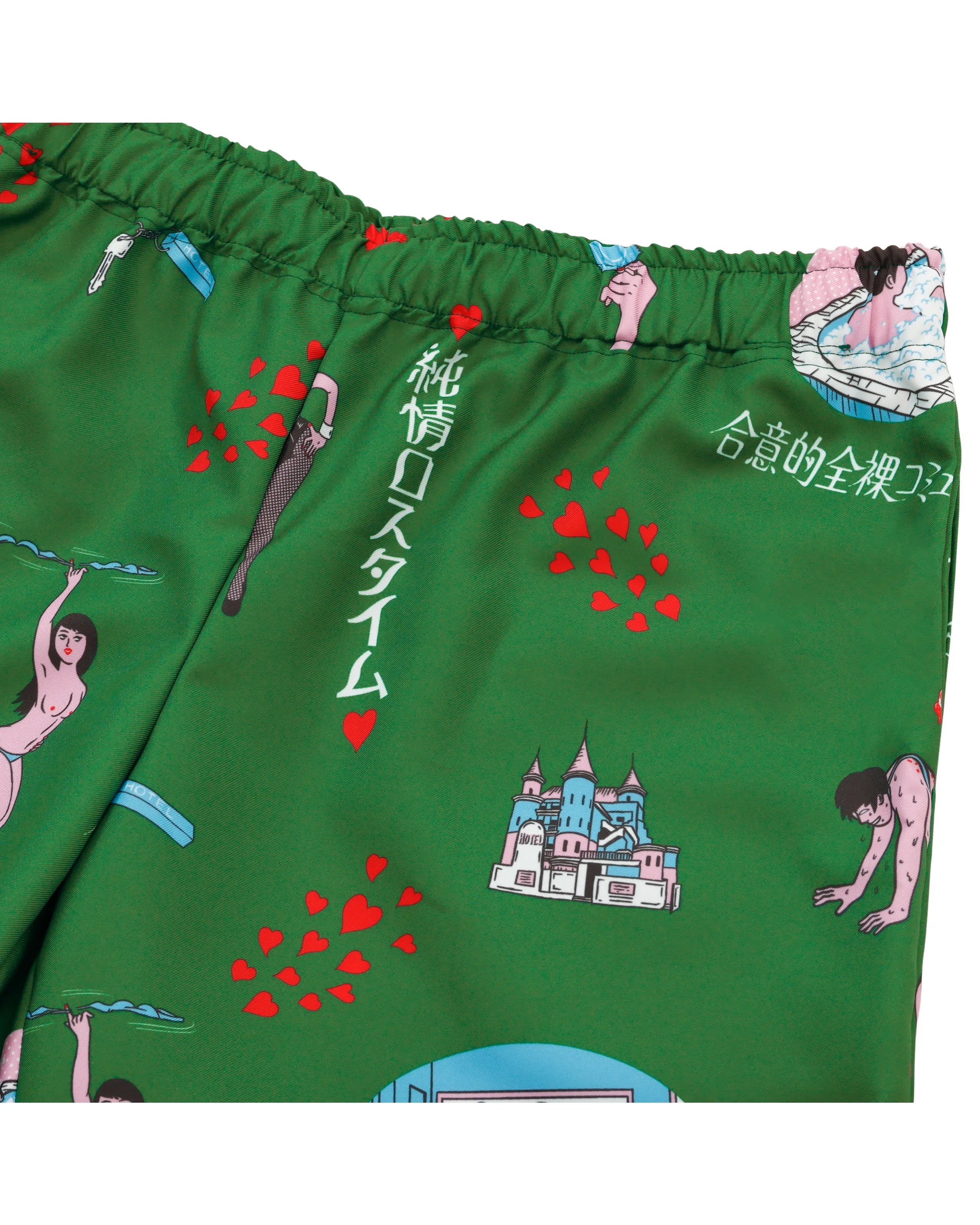 「ラブホテル」をテーマに、インターチェンジ付近にありそうな架空のレトロなラブホ内でのシーンイラストを散りばめた総柄&ボーダーパターンのアロハシャツ「純情ロスタイム」のデザインを使用したショートパンツ。新色のグリーンで登場。