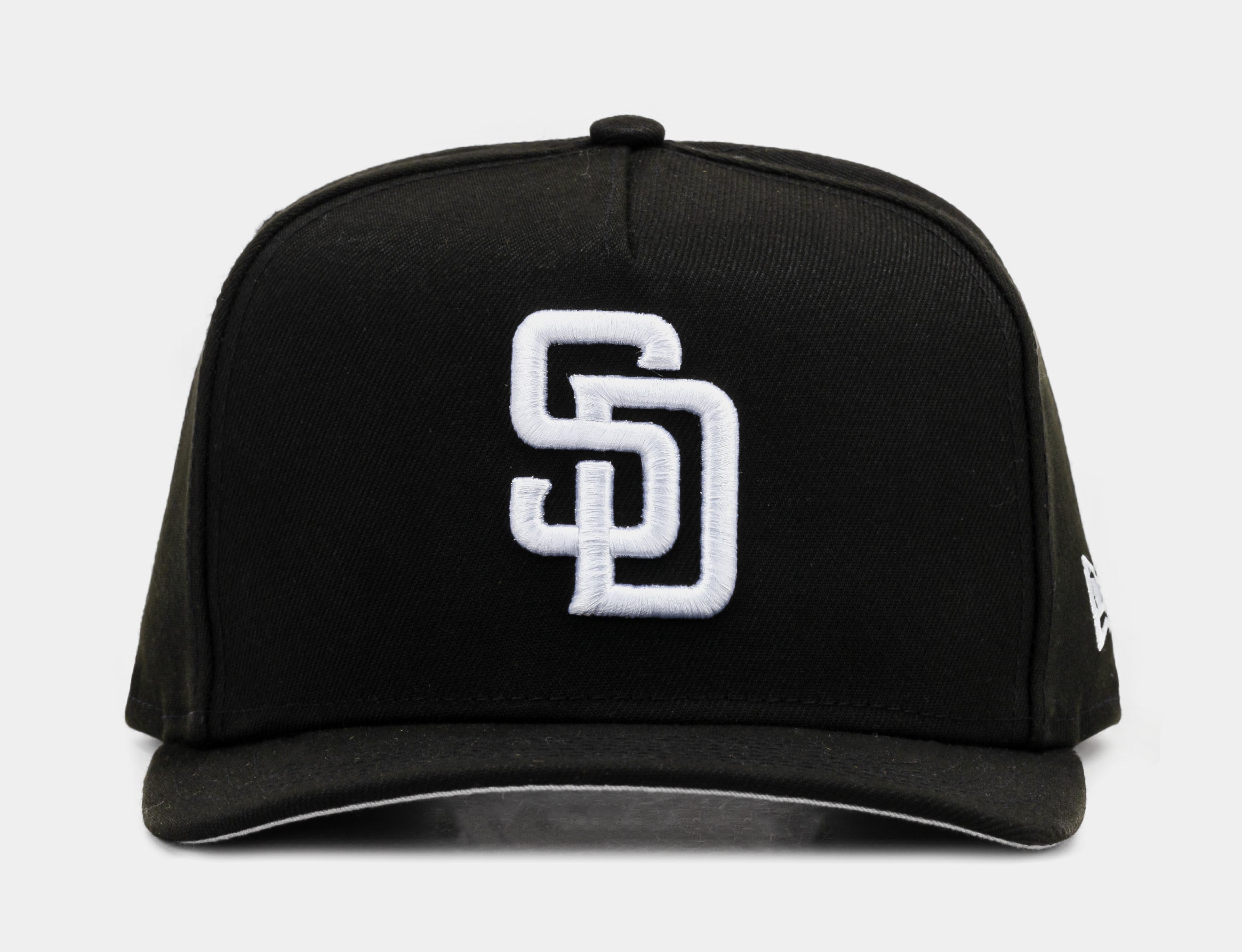 The San Diego Padres 950AF Snapback Men's Hat features a black structured crown and brim with a contrasting white embroidered team logo on the front. The back includes an adjustable snapback closure for a custom fit, combining classic style with bold team pride.