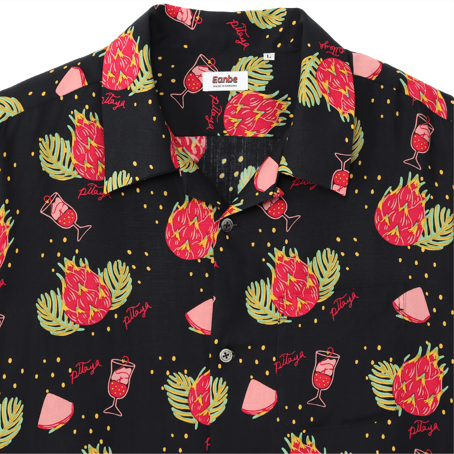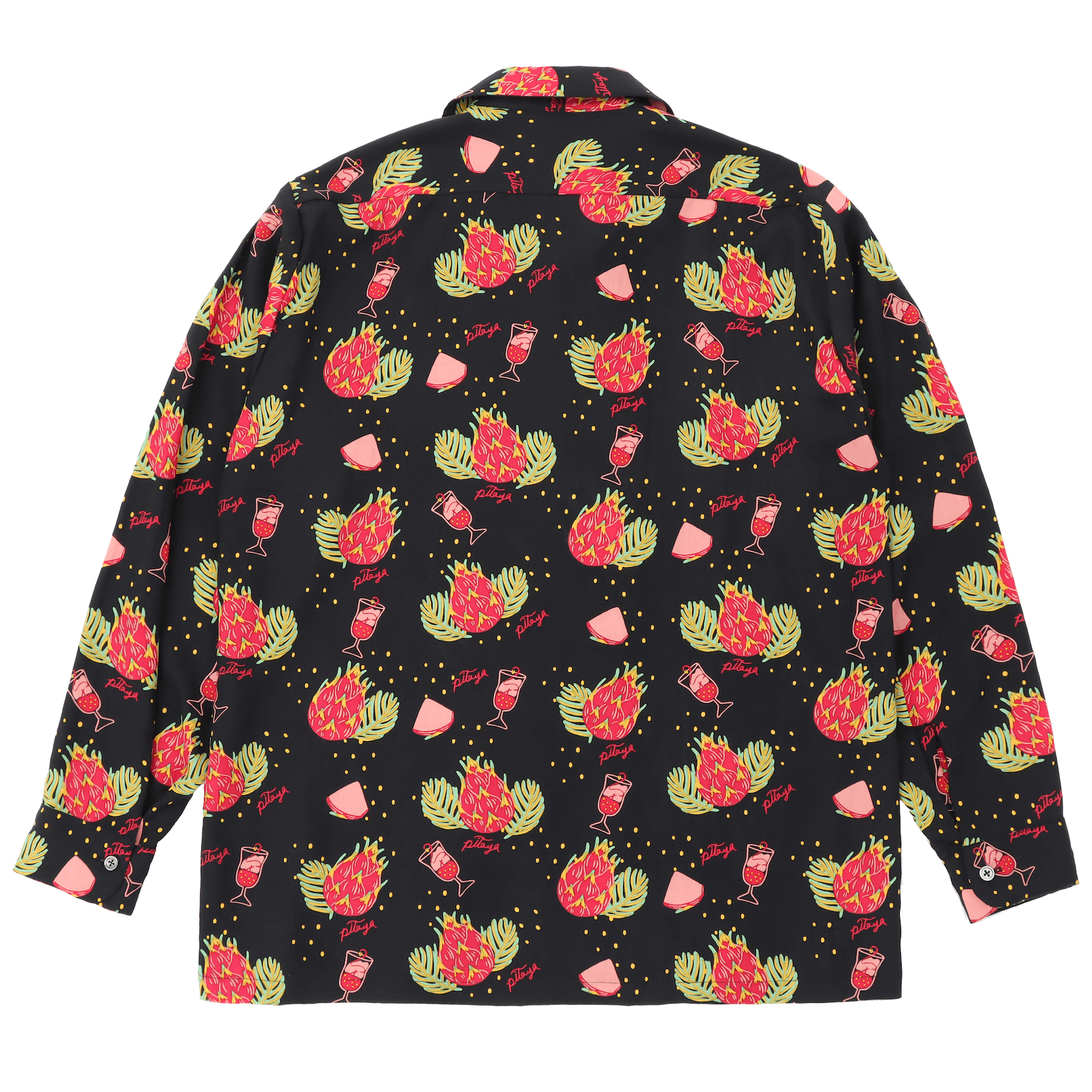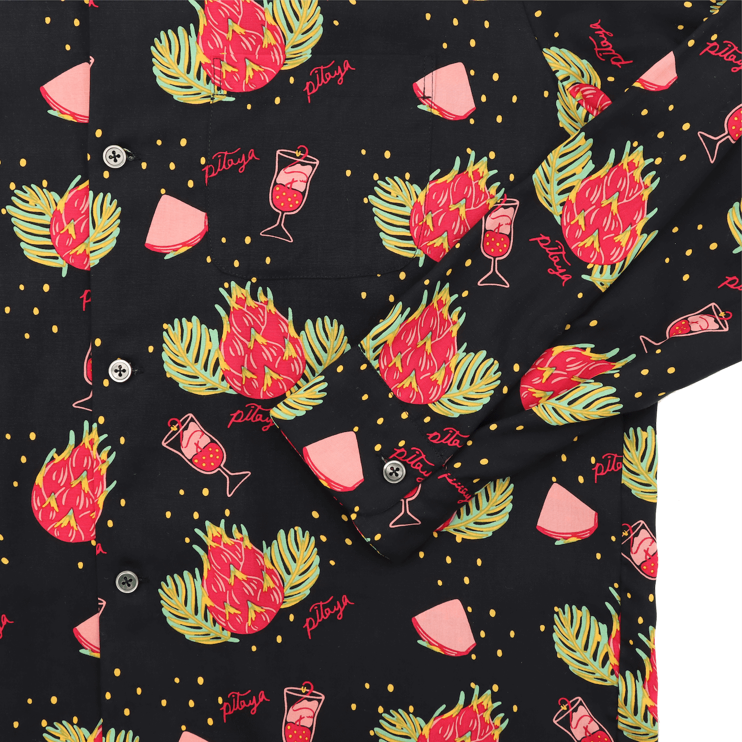 見た目は刺々しくも、中身は栄養満点と言われる南国の果実「ドラゴンフルーツ」、別名「ピタヤ」をモチーフにしたハワイアンシャツ。