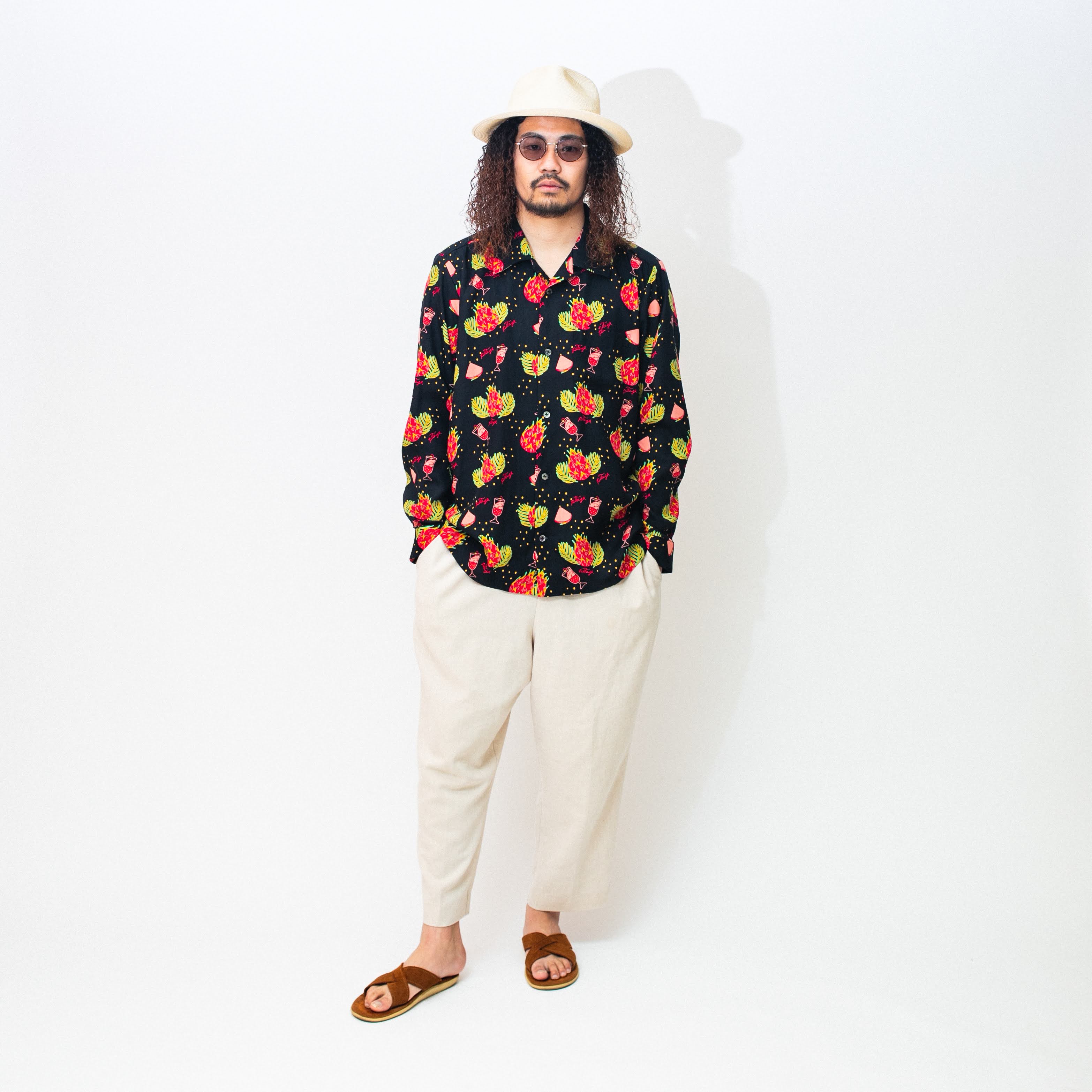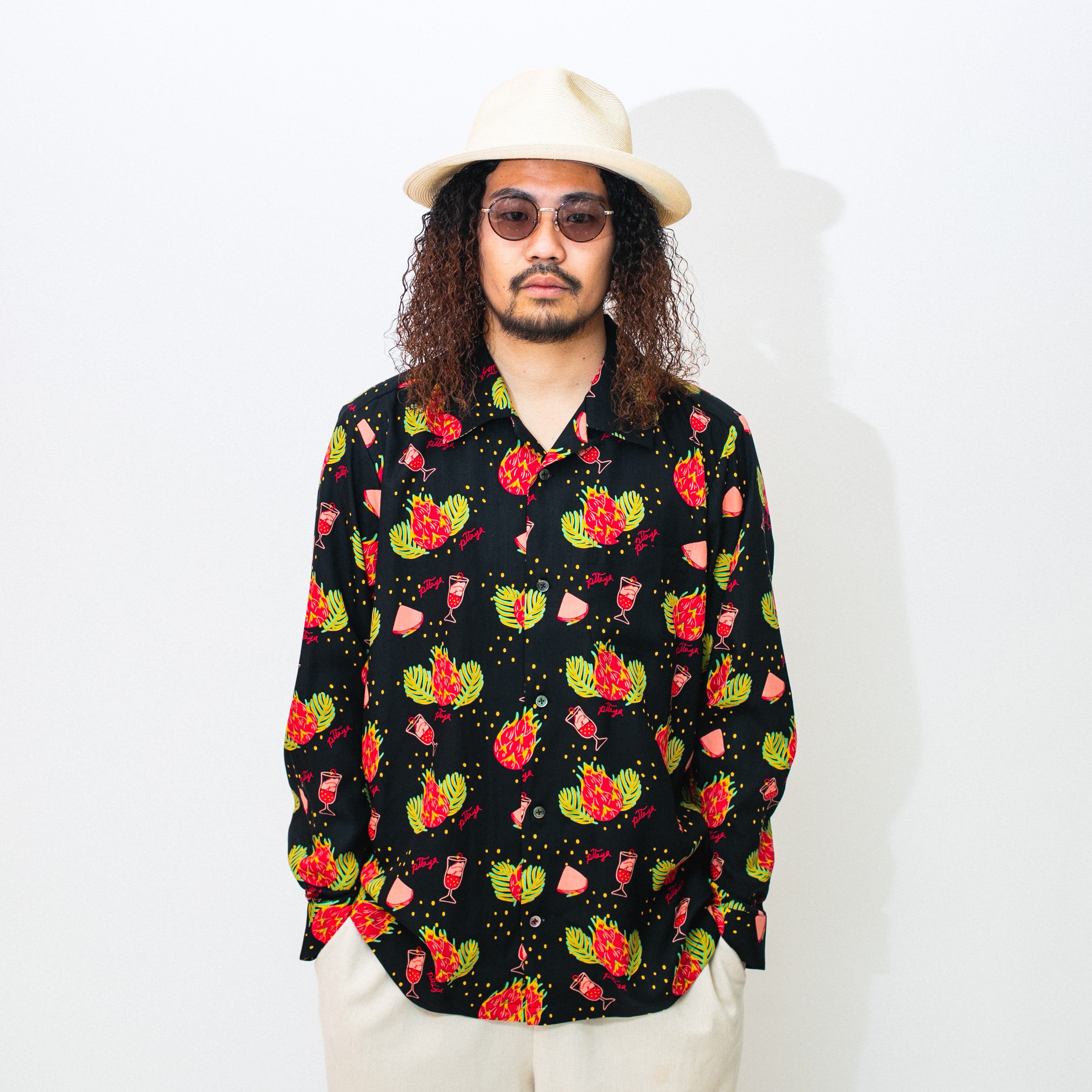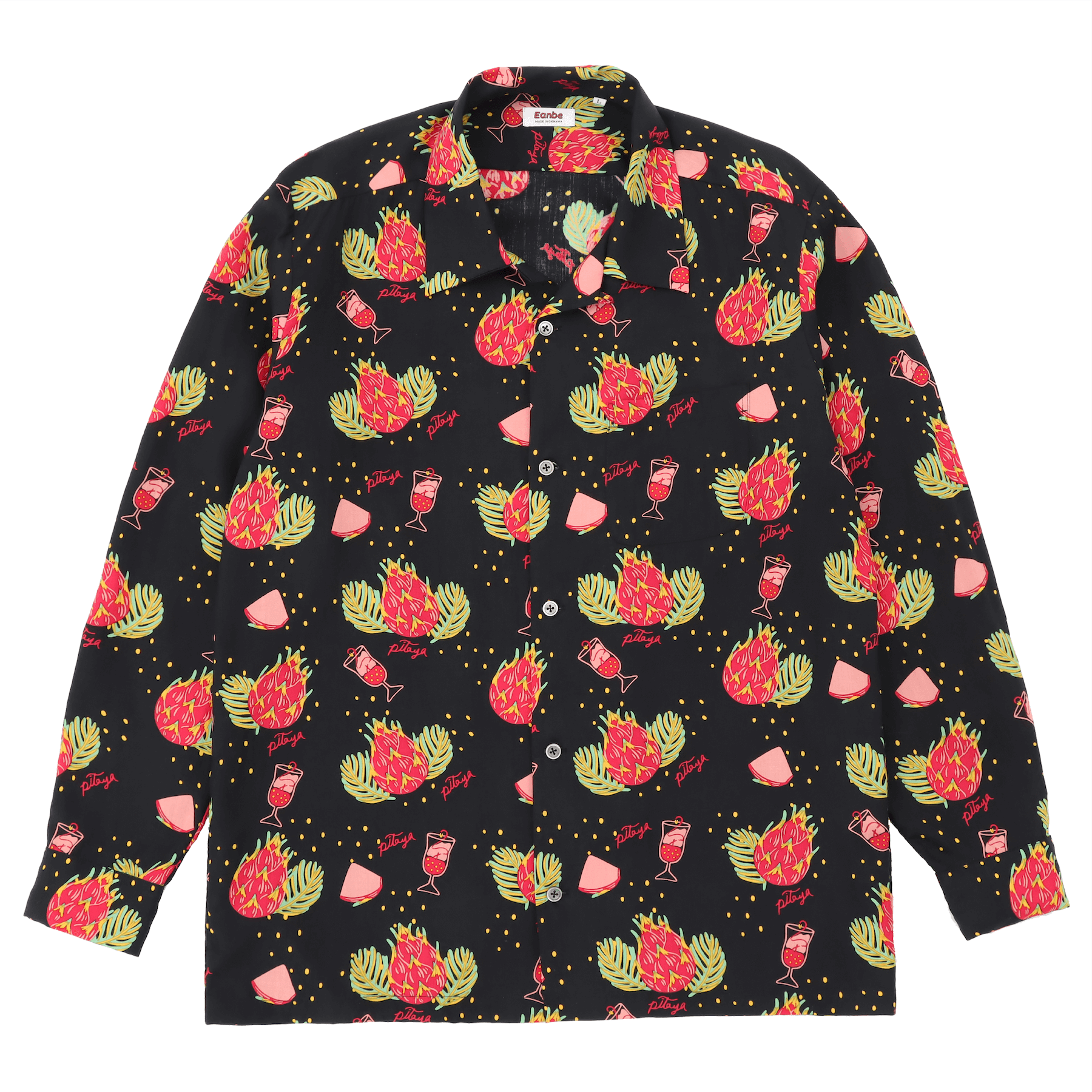 見た目は刺々しくも、中身は栄養満点と言われる南国の果実「ドラゴンフルーツ」、別名「ピタヤ」をモチーフにしたハワイアンシャツ。
