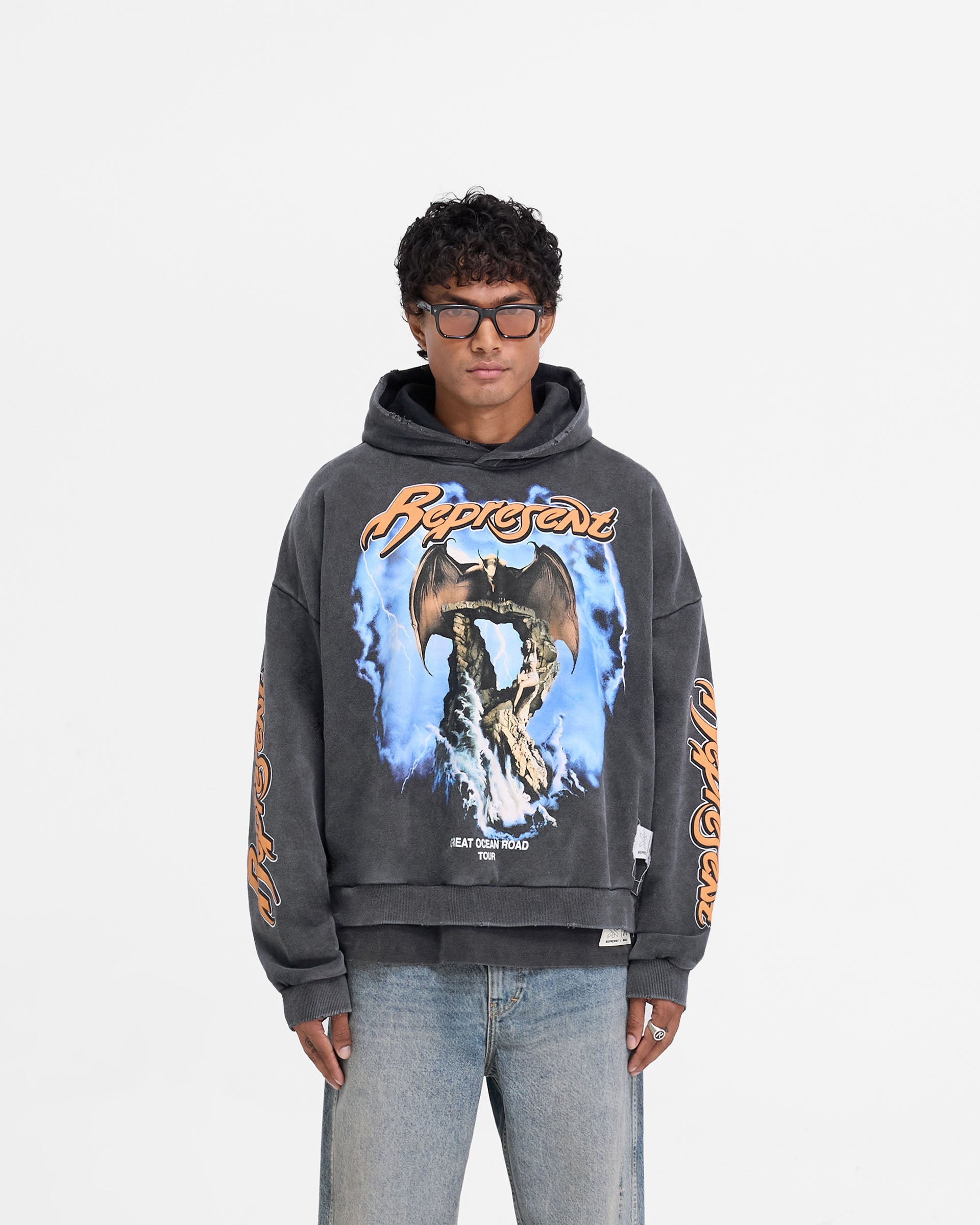 Introducing the Represent x Marais Great Ocean Hoodie in Vintage Grey, an oversized boxy hoodie crafted from heavy weight jersey cotton. The hoodie has a screen print graphic to the front, back and arms, and is finished with nibbling distressed details to the hood edge, cuffs and hem, and a woven branding label to the hem.
