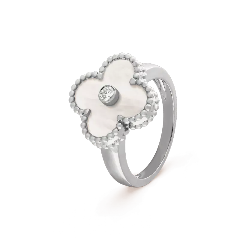 ヴィンテージアルハンブラリング、ホワイトゴールド、ホワイトマザーオブパール、ラウンドダイヤモンド、ダイヤモンド品質DEF、IFからVVS。